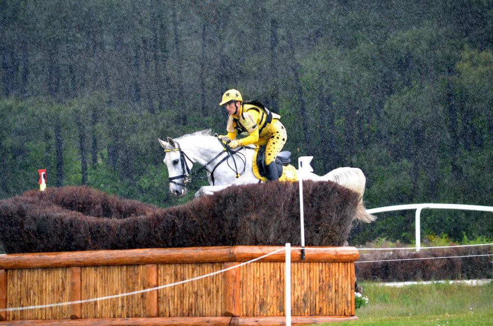 We have a new poster child for Insanity in the Middle. This is Margit Appelt, and the horse without a shred of dignity left is Space Jet. Margit, who hails from Austria, rocked this yellow and black ensemble in the Saumur CCI3* last weekend. A quick Google search shows Margit busts this out on all her cross-country runs. Here’s a video of the outfit in action at Jaroszówka CIC2* last month.