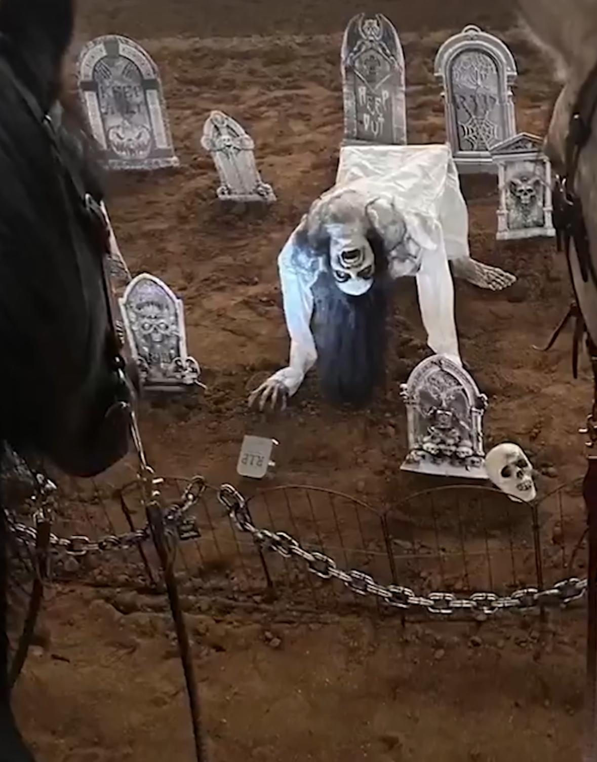 ABC News said it best in their caption, “These police horses ain’t afraid of no ghost!” To be frank, some of these decorations would have scared the Horse Nation staff more than it scared these patrol horses! It’s the back bending, demon looking display that gave us chills, but for the horses it was just another day at the office.