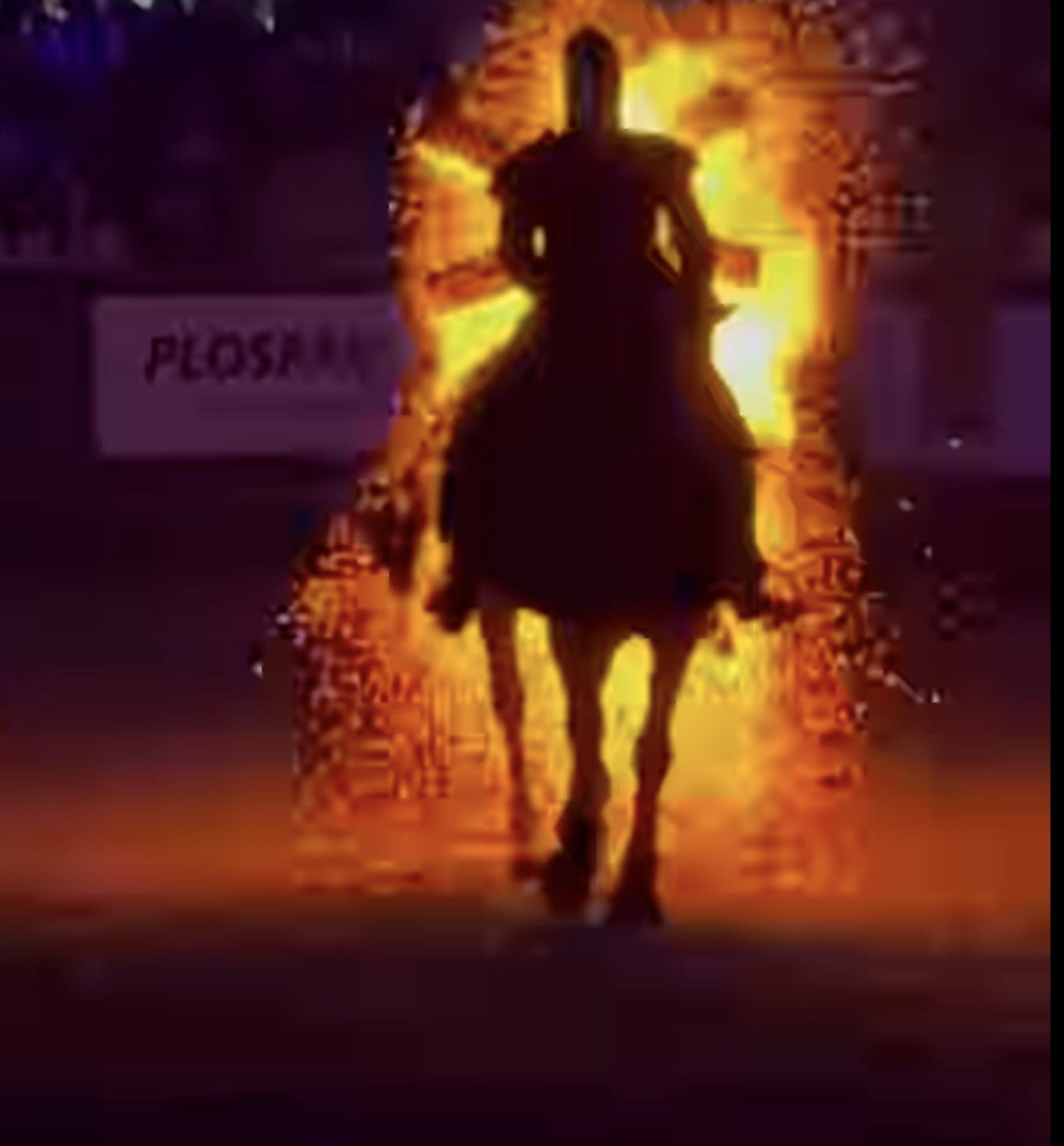 As someone who spends a lot of time around horses and firearms and fair amount of time around horses and pyrotechnics, I have to admit this is pretty impressive. I would love to know what the quarter sheet that the horse is wearing is made of. Also, desensitizing a horse to this level of fire seems … just next level.