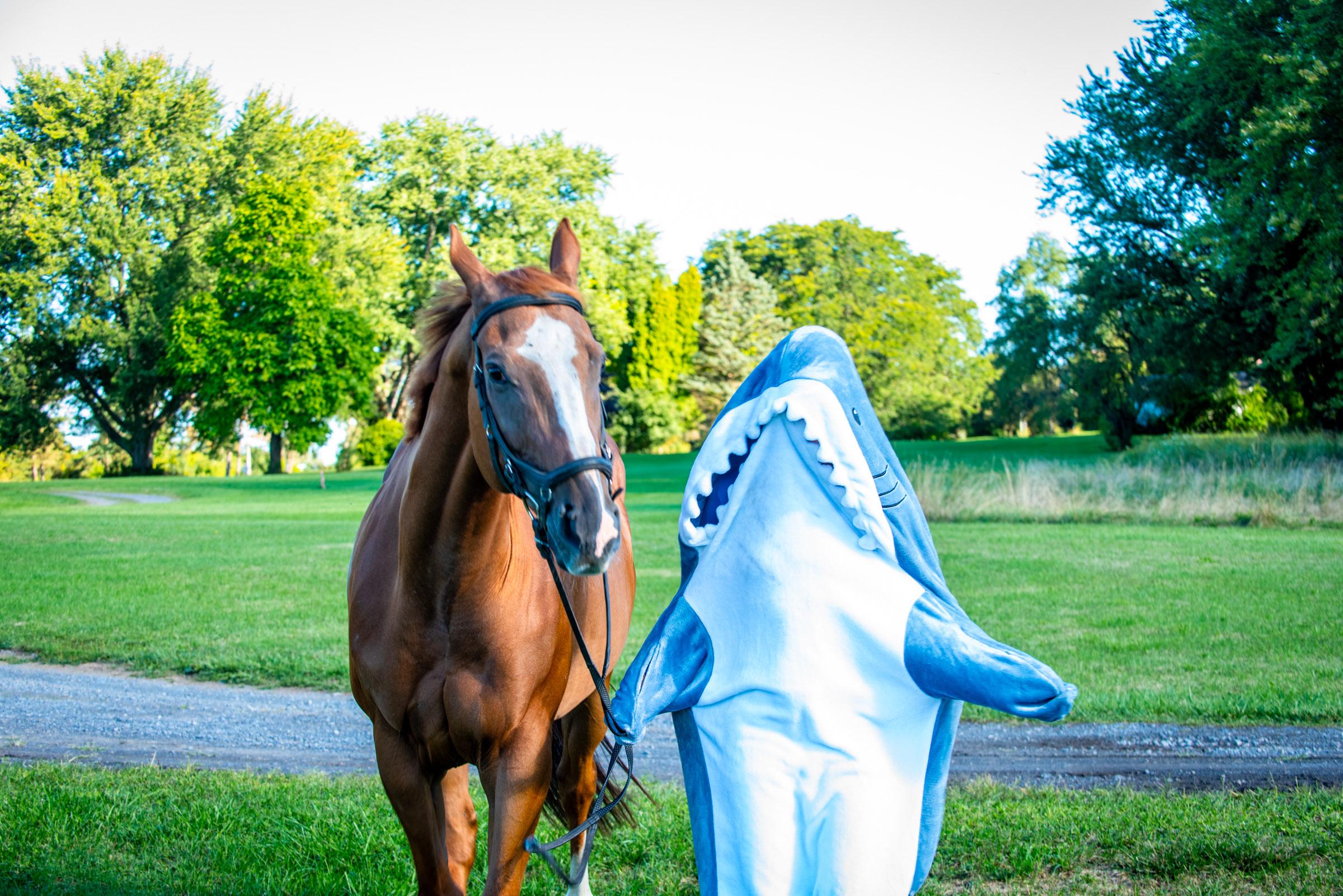 So go ride folks, and enjoy your smart horses, whether they tolerate a blow up Dino (or Shark Onesie) or not.