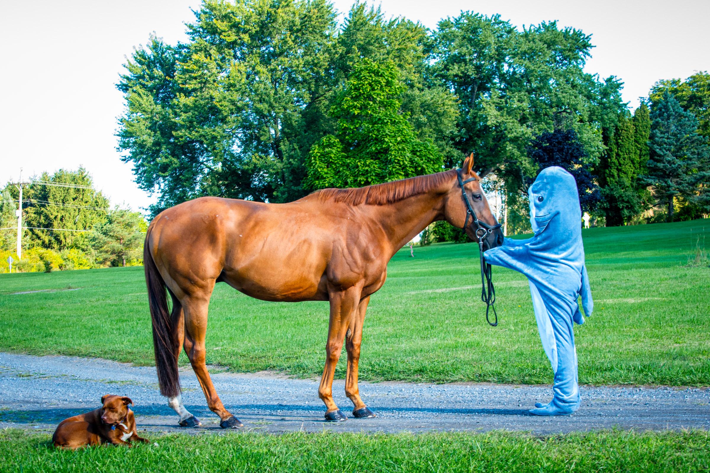 So my usually semi-serious barn laughed through a morning of a shark onesie for conformation photos and a precarious dinosaur ride. My only hope now is that folks can see that Rhino is just a typical, good egg Thoroughbred who is willing to play whatever game you want to teach him. And I’m pretty sure, other than Rhodie (Western Ridge — no chance in overriding his flight response), I could probably have gone slowly and done this stunt with any horse in the barn. Neil might have been a more exciting ride, but that’s because Neil is just perpetually an electric eel — he’s still smart and still would have figured it out.)