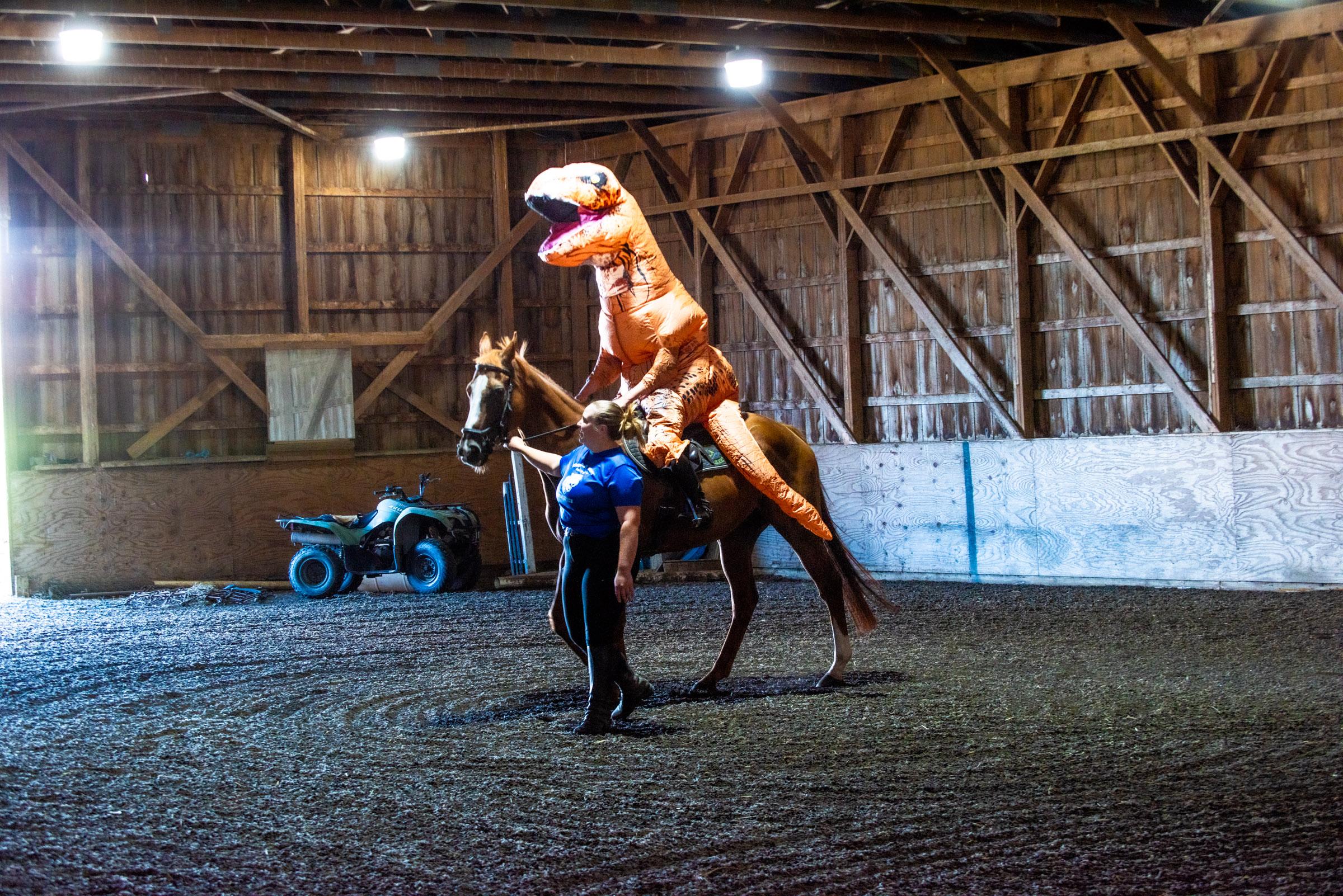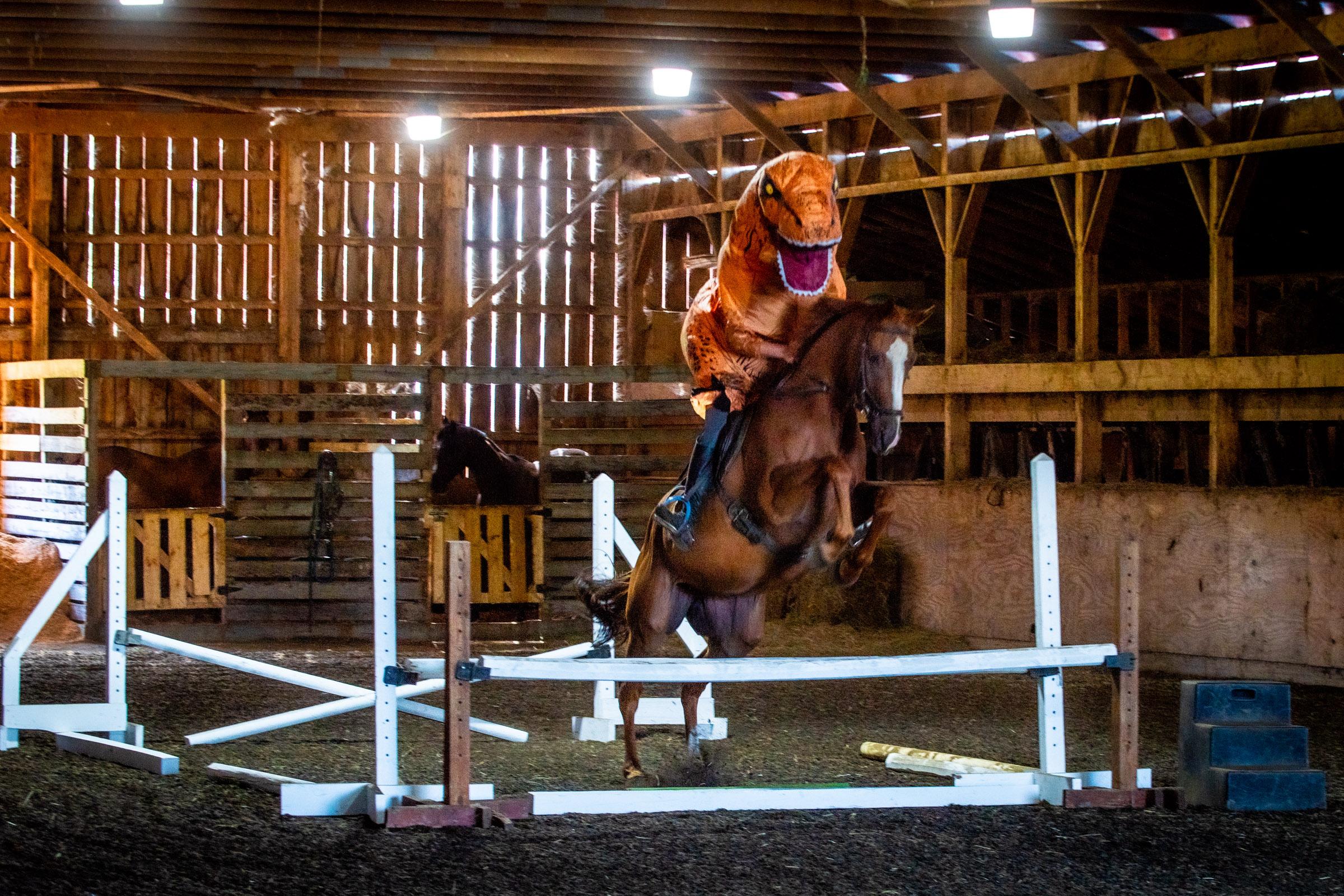 Last Saturday, I did probably the least intelligent thing on horseback I have done in ages. Possibly ever. I donned a blow up Dinosaur costume and rode 10-year-old Thoroughbred Classy Cowboy (Rhino) as I would for a usual sale ad: walk, trot, canter, and a few fences. (I’ll get to the backstory in a minute — and I promise it will make some semblance of sense.) The important part here was that Rhino figured out the dumb game — tote this human in this inflatable bobbling predator costume around like nothing has changed.