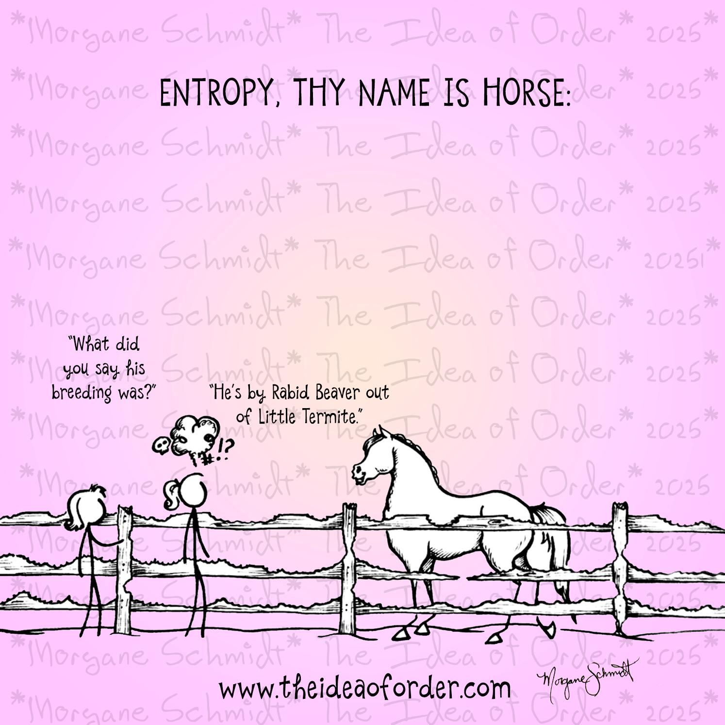 Morgane Schmidt is, among many things, an equestrian who still hasnโt quite decided what she wants to be when she grows up. Author of Life with Horses Is Never Orderly, she knows all about the madness that comes with the equine territory, having owned and competed horses in eventing and dressage for years. A lifelong fan of the classic equestrian cartoons penned by internationally renowned artist Norman Thelwell, she began her own comic series in 2011, sharing deftly funny reflections on life with horses on Horse Nation as well as her personal website. A native Floridian, she spent a decade in Reno, NV, where she was able to confirm her suspicion that snow is utterly worthless (she has since regained her sense and moved back to the Florida swamp). Though she has run the gamut of equestrian disciplines, her favorite is dressage. She has completed her USDF bronze and silver medals and is currently working on her gold. Generally speaking, her life is largely ruled by Woody, a 14.2 hand beastly quarter horse, Willie, a now beastly 15-year-old Dutch gelding, and Milona DG, an 8 year old KWPN chestnut mare (you can make your own inferences there…). Visit her website at www.theideaoforder.com.