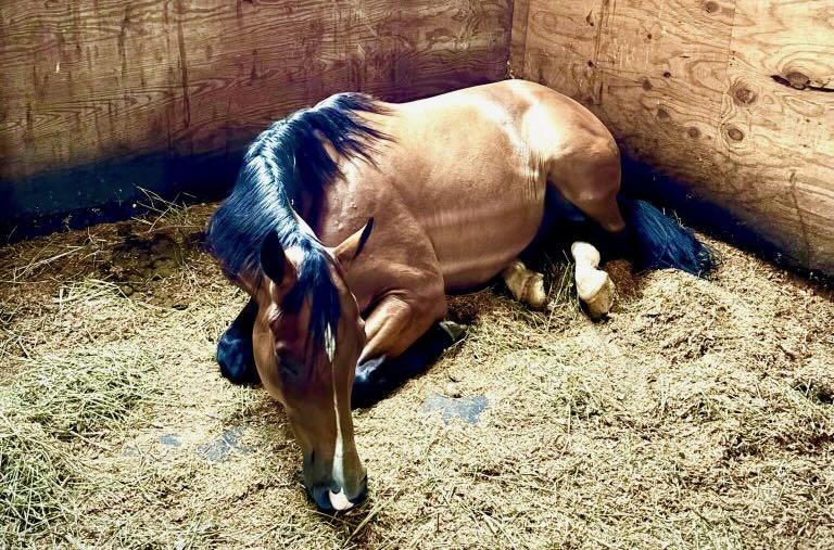 When we hit about three months into his recovery, he finally laid down. I walked by his stall and called over Alanah, my working student. I was super excited. He was asleep on his side, occasionally running as he slumbered (so presumably having hit REM stage). Seven hours later though, he was still down. At about 11 at night, I called the vet. He was either THAT tired or he was dying. And that is a pretty ridiculous vet call to make.