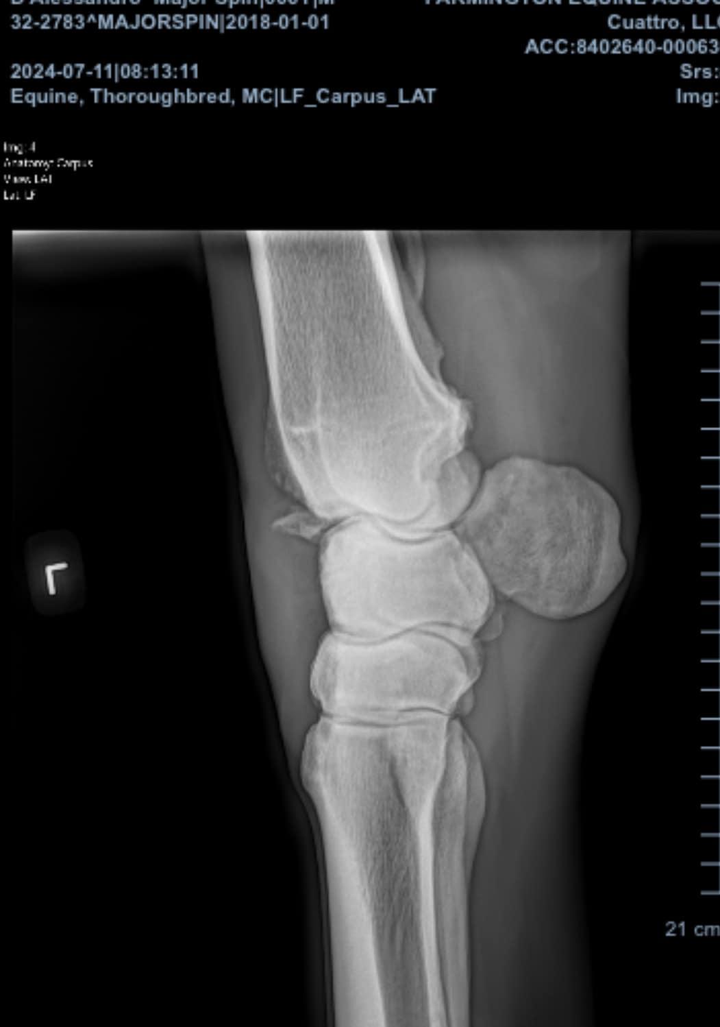 But Major Spin made it. When I first met him, he was still in the running line up at Finger Lakes Racing, despite being dead, dead lame on his left knee. It was so egregious that when the race trainer would not X-ray, the track vet donated their time and the films to us to help get him out of that situation. And so, because I’m a sucker, I did. I bought Spin (yep, you heard that right — that trainer wouldn’t let him go for free, lame as hell to a good home… what a great guy…) and decided that we could make a decision about his future after a few months of turnout. And with time and rest, he kept getting better. And then he simply was sound.