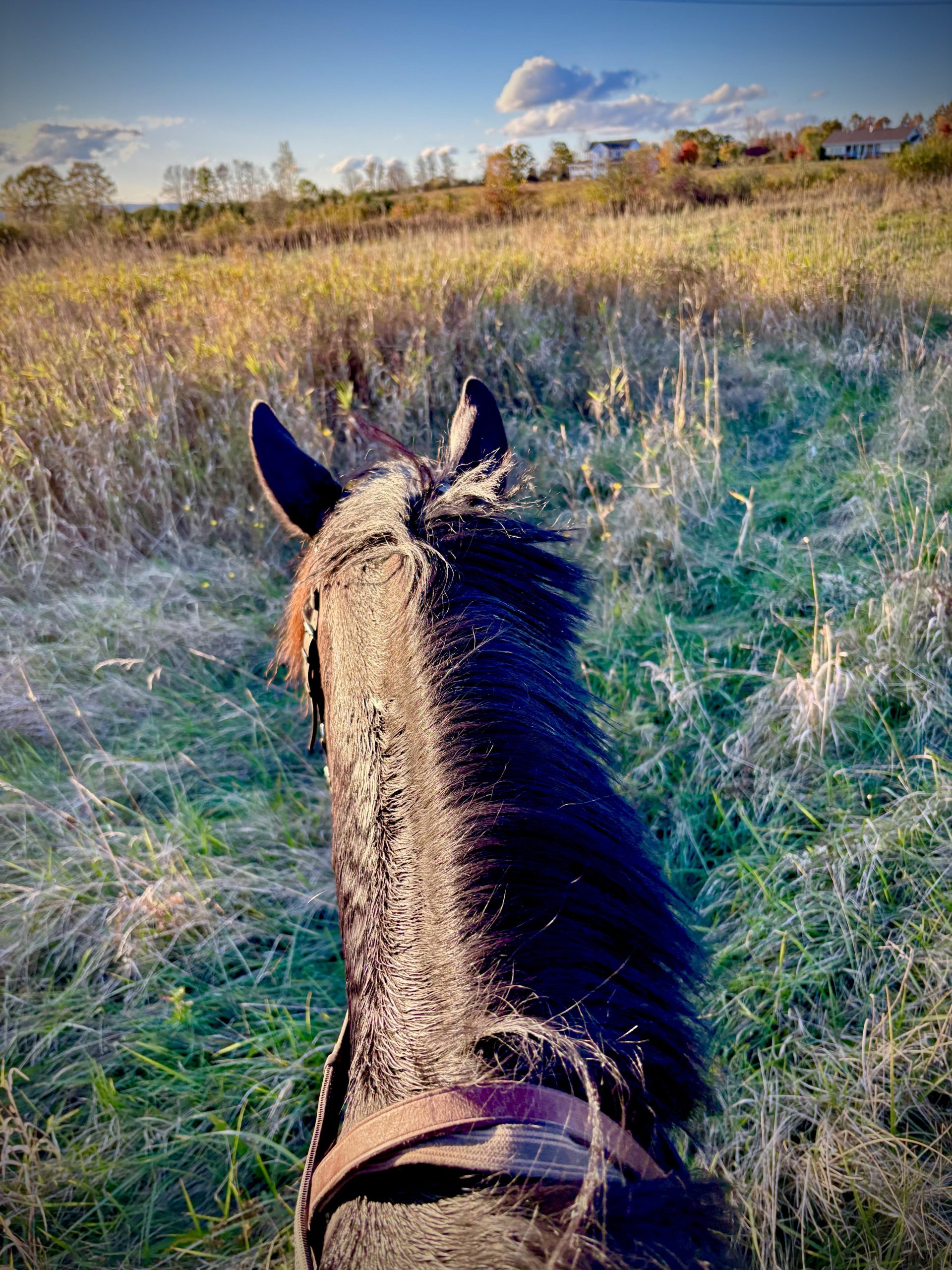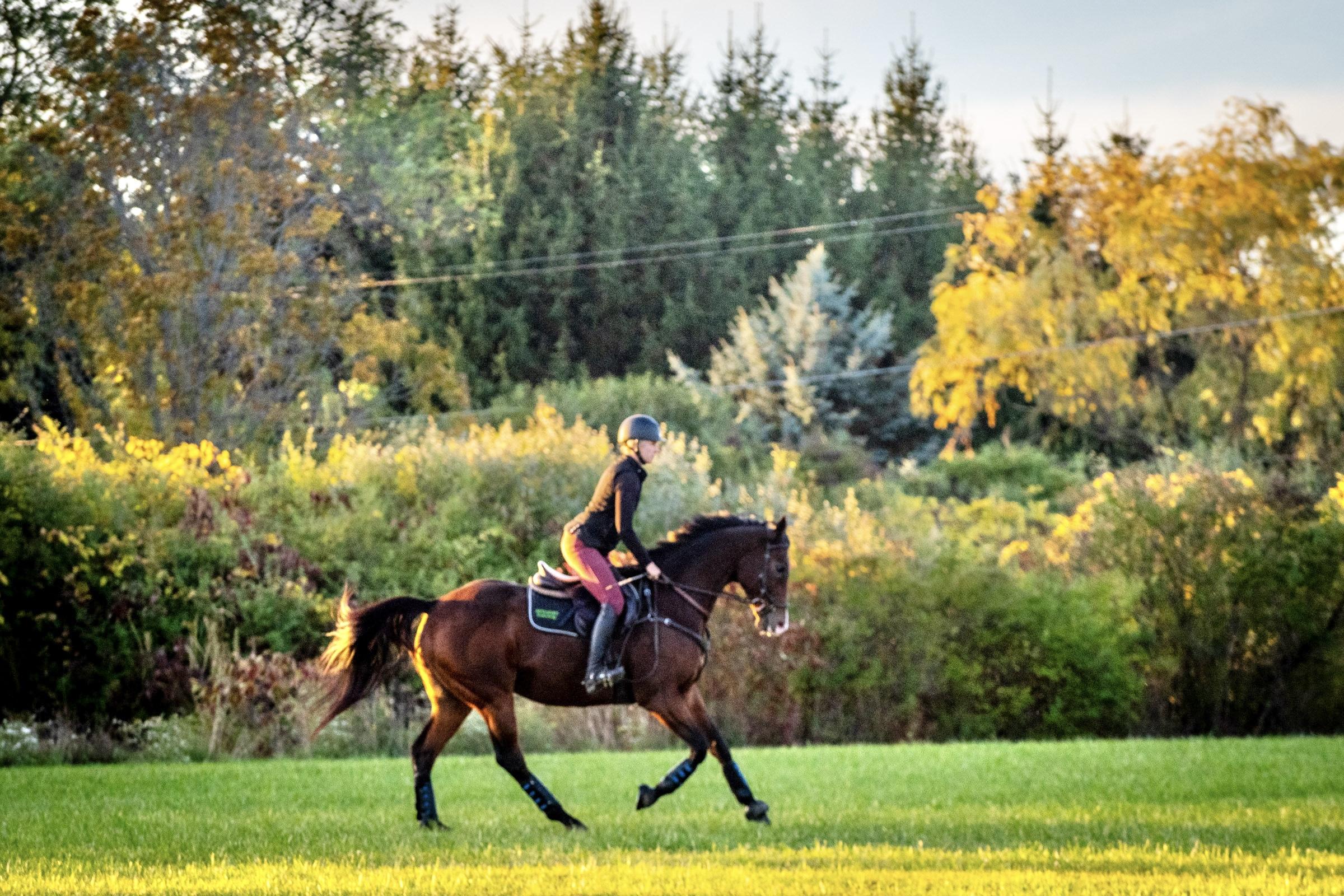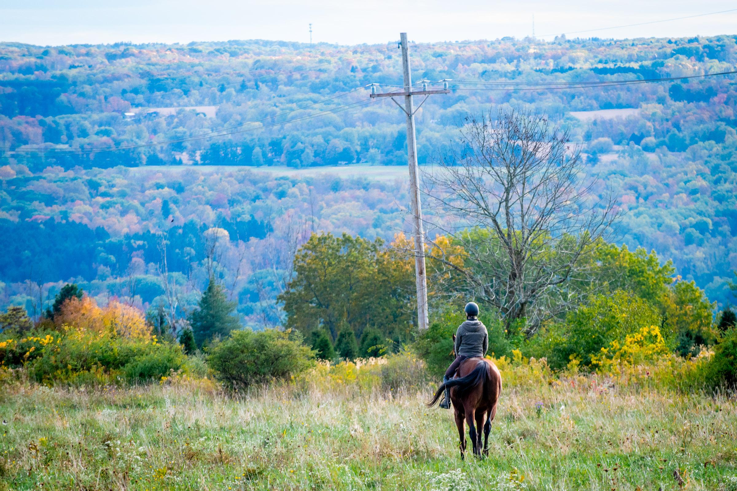 Generation (Stall 13 adoptable horse) hacking out at Kivu in the mid fall. Photo by Lily Drew.