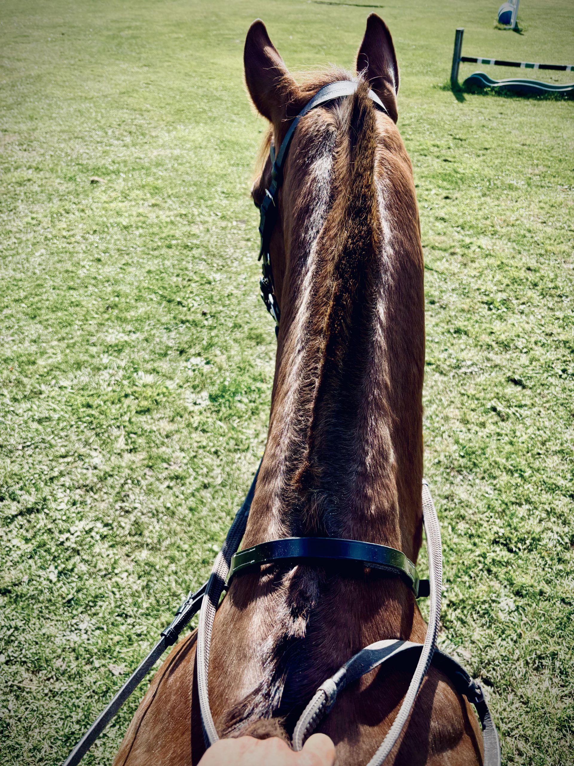 A quick caveat: I have mentioned this to folks and they have often said, “Oh, that’s why I wear a breast plate/martingale” indicating the ability to grab something should the world decide to attack. But I’d push back and recommend the neck strap instead. The martingale puts your hand low near the saddle, decreasing the base of support and making a rider tippier. The more forward-set strap allows a wider base of support, and helps a rider stay more stable, especially when one is unsure of what direction all that momentum is going to go.