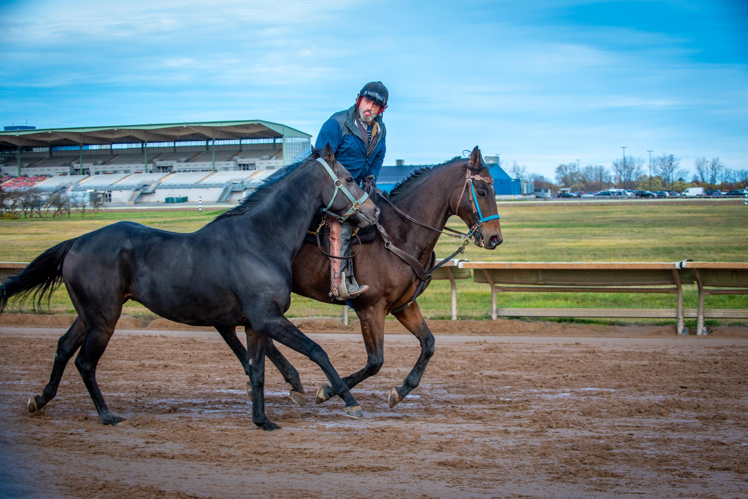 Photo of tackless breezing from Finger Lakes Racing — track trainers have to be flexible in how they train, too. Photo by author.