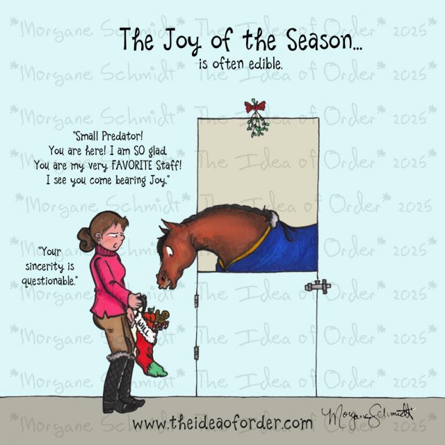Morgane Schmidt is, among many things, an equestrian who still hasn’t quite decided what she wants to be when she grows up. Author of Life with Horses Is Never Orderly, she knows all about the madness that comes with the equine territory, having owned and competed horses in eventing and dressage for years. A lifelong fan of the classic equestrian cartoons penned by internationally renowned artist Norman Thelwell, she began her own comic series in 2011, sharing deftly funny reflections on life with horses on Horse Nation as well as her personal website. A native Floridian, she spent a decade in Reno, NV, where she was able to confirm her suspicion that snow is utterly worthless (she has since regained her sense and moved back to the Florida swamp). Though she has run the gamut of equestrian disciplines, her favorite is dressage. She has completed her USDF bronze and silver medals and is currently working on her gold. Generally speaking, her life is largely ruled by Woody, a 14.2 hand beastly quarter horse, Willie, a now beastly 15-year-old Dutch gelding, and Milona DG, an 8 year old KWPN chestnut mare (you can make your own inferences there…). Visit her website at www.theideaoforder.com.