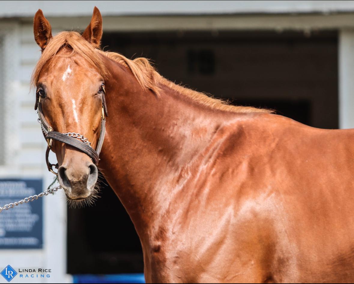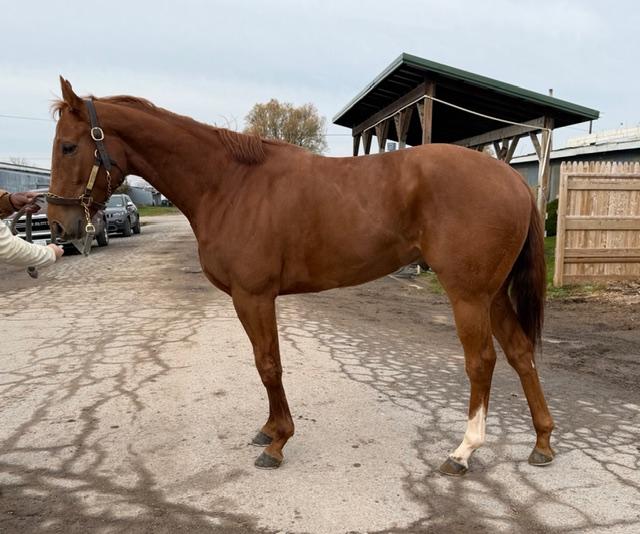 This petite – 15.3? (once he gets back in the main barn, I’ll put a stick on him and find out for real) four-year-old redhead absolutely is a Curlin. His sire — Vinno Rosso (Curlin) — passed along the broad, flat forehead, independent personality, the athletic build, and somewhat flat-kneed gait. As a two-year-old, he was listed at $70,000 for the Ocala Breeder’s Sale (Spring) in 2023 and RNA-ed (reserve not attained), so remained with his connections. He ran 16 times, bringing in a respectable $87,229 for his connections.
