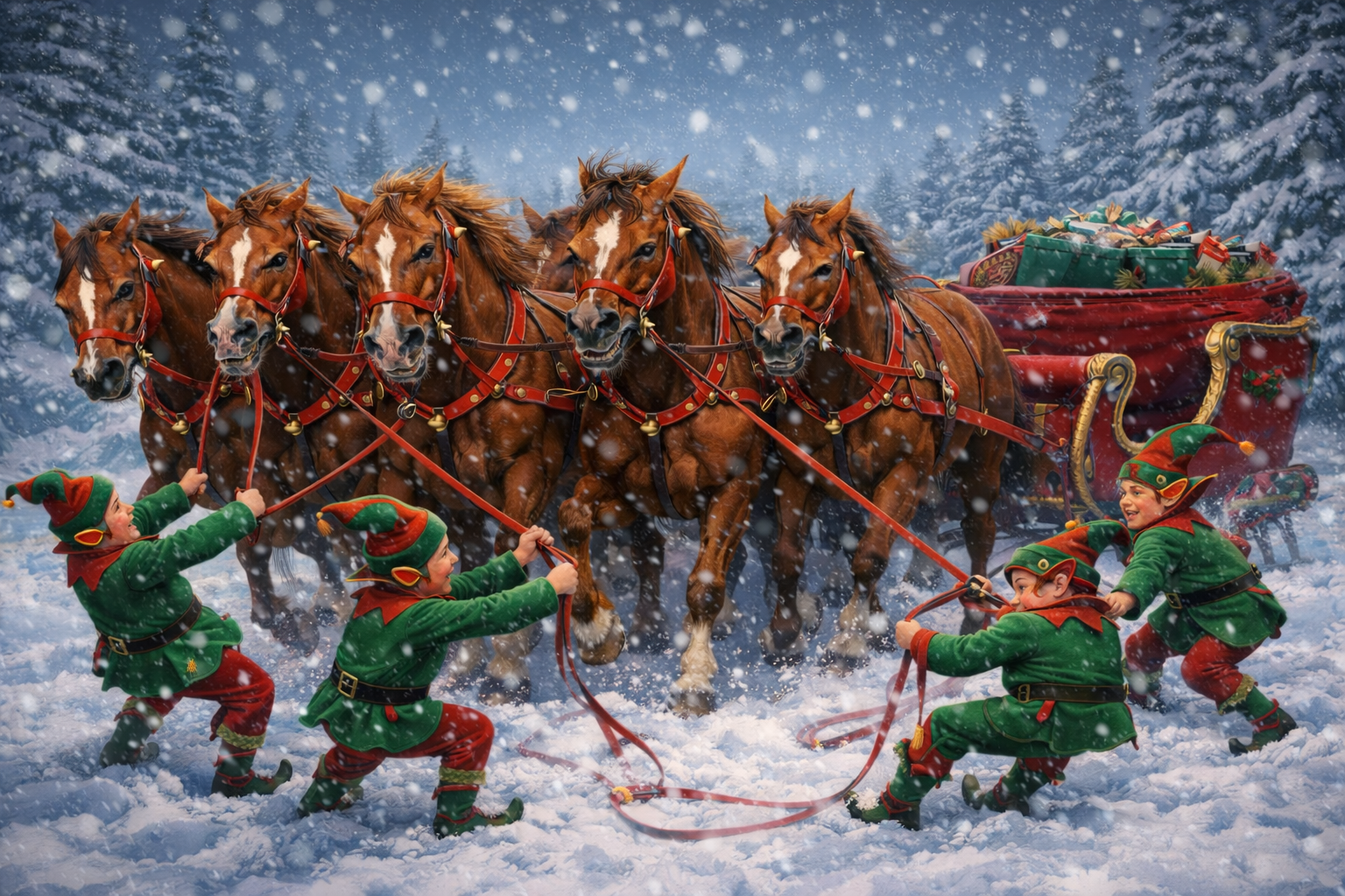 Santa’s elves — tiny, earnest, dangerously optimistic — standing in the snow behind the workshop with a sleigh, eight chestnut mares, and absolutely no idea what they’ve done to deserve this. Someone (probably an elf who has never met a horse) had said, “How hard can it be? Hitch them up and go!”