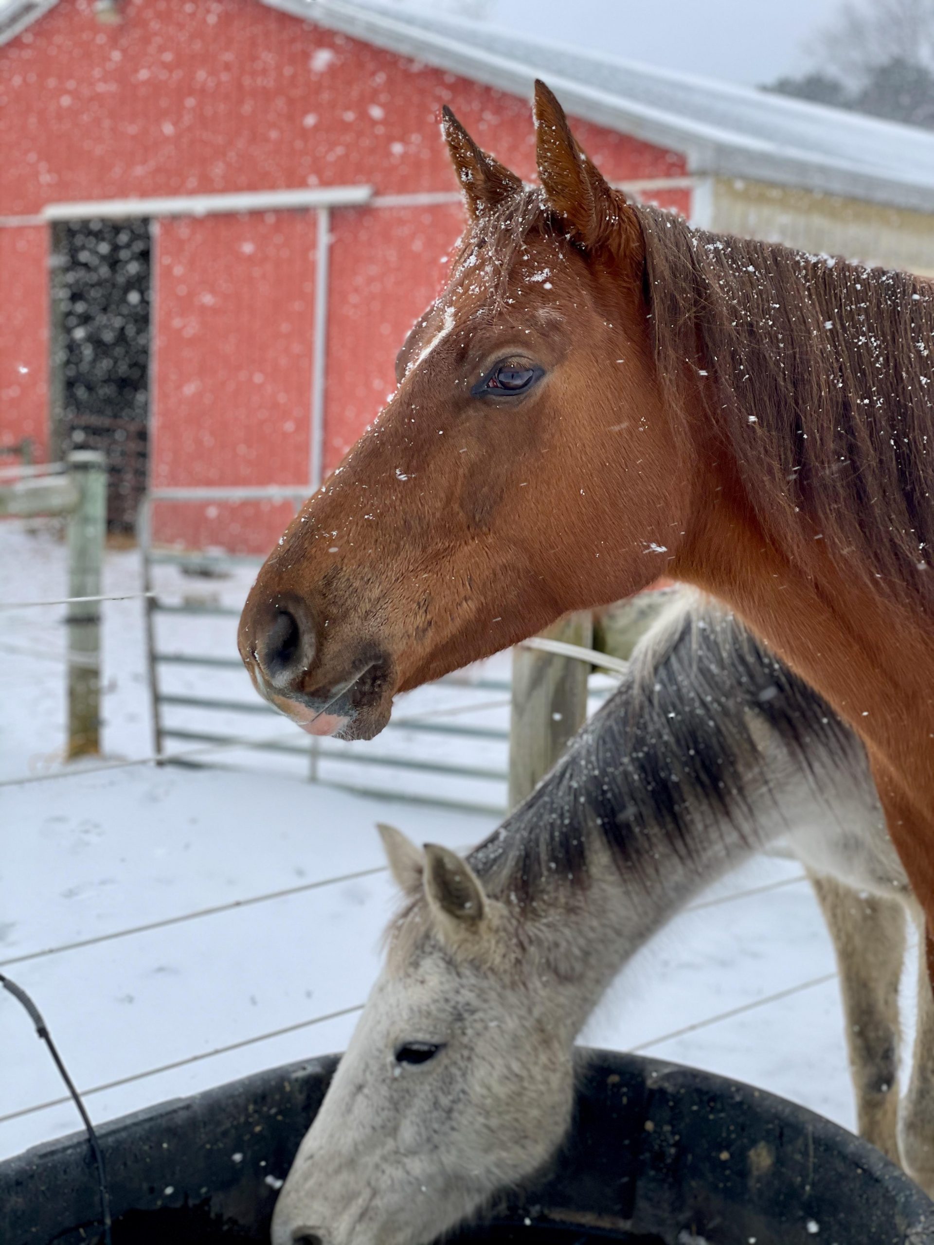 They are often excellent performers who treat winter like an inconvenience rather than a season. They don’t want to be cold, but they also don’t want to stop working. Snow days are insulting. This horse likely is a chestnut mare (or at least in the neighborhood thereof).