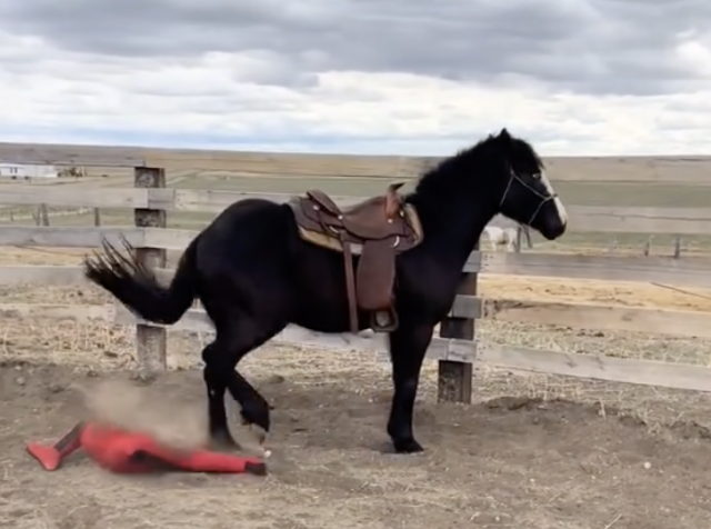 Cash casually dumped his training dummy rider on the ground and followed it up with multiple swift kicks for good measure, just to make his point crystal clear. No bucking fit, just a calculated decision to remove the fake human and remind it who’s in charge.