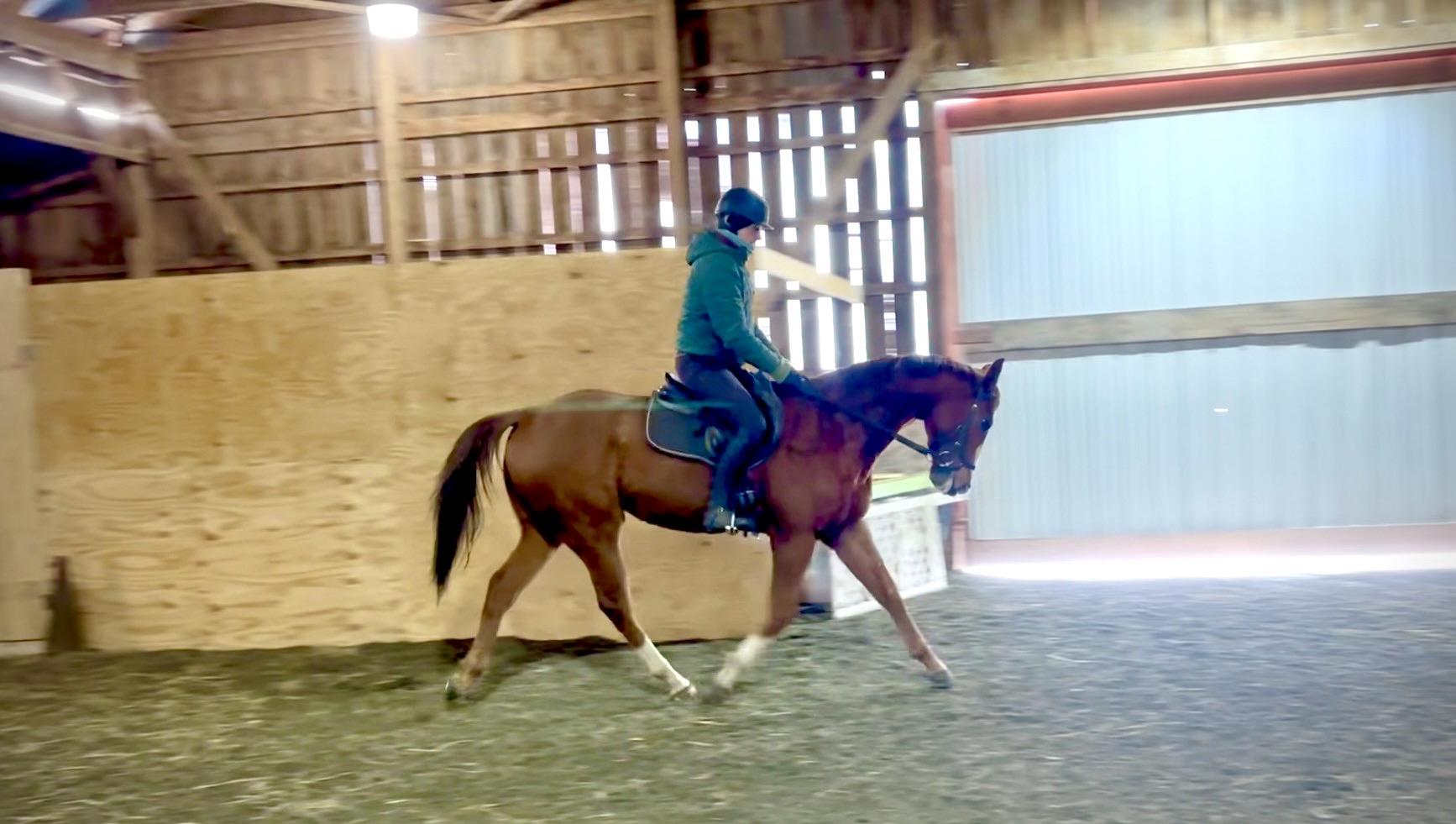 Making the best of a smaller arena while turnout paddocks are set. Here, Oats (Otis by the Cape) works on his 20-meter circle skills and is incrementally learning to move his shoulders out into the bend. Screenshot from video by Lily Drew.
