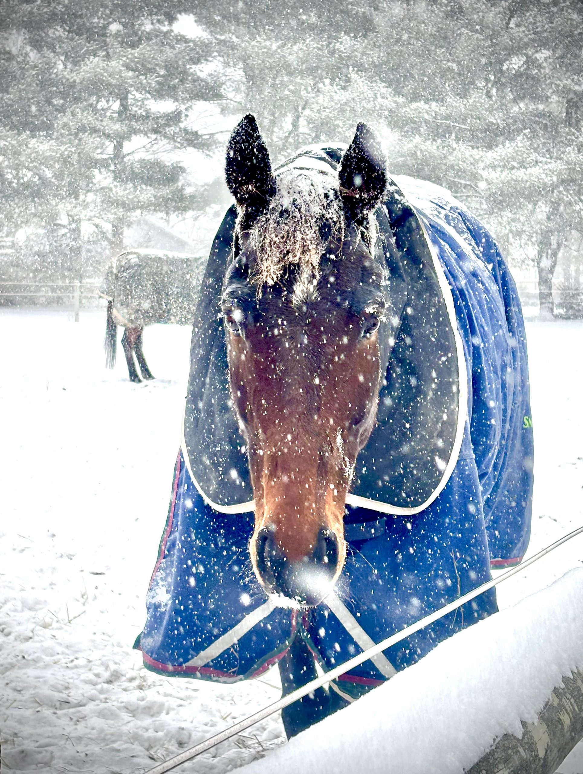 Bruce (Scotty Silver) makes the best of a snow day at Kivu Sporthorses in the currently great white north of New York. Photo by author.