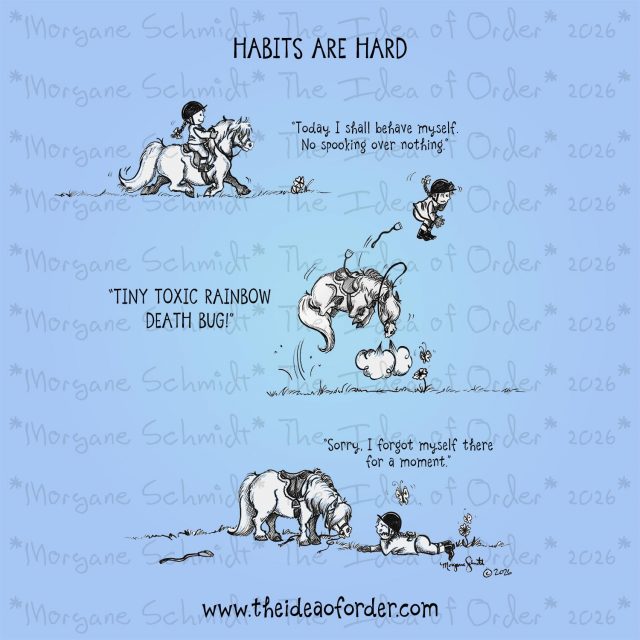 Morgane Schmidt is, among many things, an equestrian who still hasn’t quite decided what she wants to be when she grows up. Author of Life with Horses Is Never Orderly, she knows all about the madness that comes with the equine territory, having owned and competed horses in eventing and dressage for years. A lifelong fan of the classic equestrian cartoons penned by internationally renowned artist Norman Thelwell, she began her own comic series in 2011, sharing deftly funny reflections on life with horses on Horse Nation as well as her personal website. A native Floridian, she spent a decade in Reno, NV, where she was able to confirm her suspicion that snow is utterly worthless (she has since regained her sense and moved back to the Florida swamp). Though she has run the gamut of equestrian disciplines, her favorite is dressage. She has completed her USDF bronze and silver medals and is currently working on her gold. Generally speaking, her life is largely ruled by Woody, a 14.2 hand beastly quarter horse, Willie, a now beastly 16-year-old Dutch gelding, and Milona DG, a 9 year old KWPN chestnut mare (you can make your own inferences there…). Visit her website at www.theideaoforder.com.