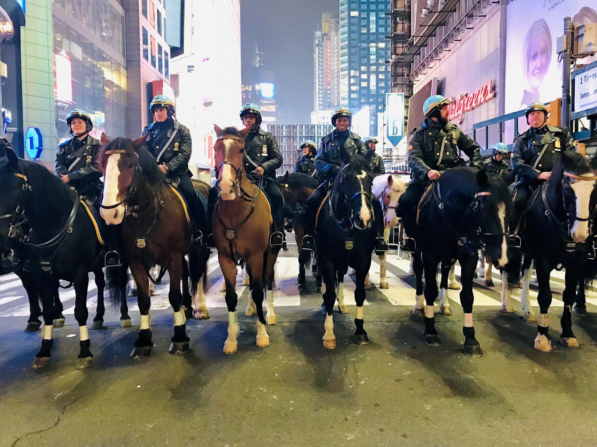 Line of NYPD Mounted Unit officers on horseback in Times Square during New Year 2022. Photo by New York City Police Department, CC BY-SA 4.0 via Wikimedia Commons.
